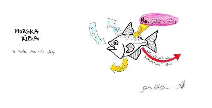 Morske ribe običajno vsebujejo manj soli, kot voda, ki jih obdaja. Da zadostijo potrebe po vodi, morajo goltati ogromne količine vode. Vodo izgubljajo preko kože, a so jo sposobne izločiti le toliko, koliko imajo v telesu odvečnih soli. Odvečno sol izločijo preko škrg in zelo koncentriranega urina. Zaradi osmo regulacije morske ribe konstantno pijejo.