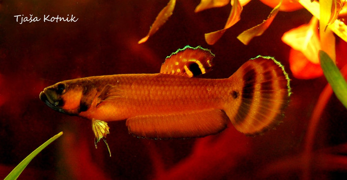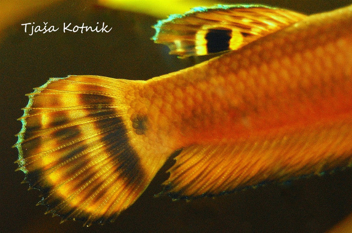 Za vrsto je značilen zelo izrazit spolni dimorfizem, samec je rdeč z črno glavo, plavuti so obrobljene s tanko linijo modre barve, glavni vzorci pa so kombinacije rdečih ter črnih črt. Na hrbtni plavuti ima samec »oko«. Na podlagi oblik in barv očesa razlikujemo popuacije. Samica je kožno rjava, rdeča ali temnorjava. Nekatere imajo črno glavo. V obdobju drsti samica po telesu dobi dve vzporedni temni črti. Tako samcu sporoči, ali je godna za drst.