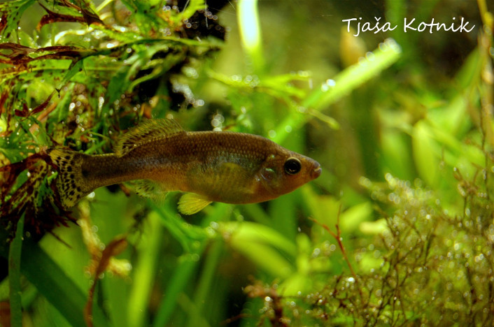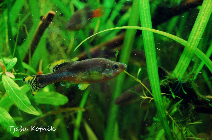 Za vrsto je značilen izrazit spolni dimorfizem, samca od samice najlažje ločimo po preobraženi podrepni plavuti, ki jo imenujemo gonopodij. Vrsta je zelo plodna in ne je svojih mladic, zato so enostavni za gojenje. Mladice se skotijo s posebnim organom trophtaenia, ki odpade nekaj ur po rojstvu. Nepoznavalec lahko ta organ zamenja za črevesne parazite .