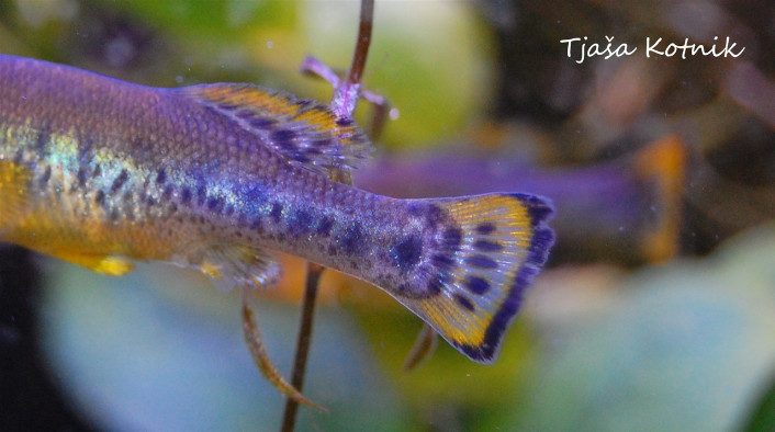 Zelo mlad, spolno zrel samec z izrazitim vzorcem ter svetlim trebuhom. Dobro je vidna temna črta, ki jo tvorijo gosto posejane pike vzdolž telesa. S takšno barvo samicem sporoča, da je mlad, vitalen in pripravljen za parjenje.