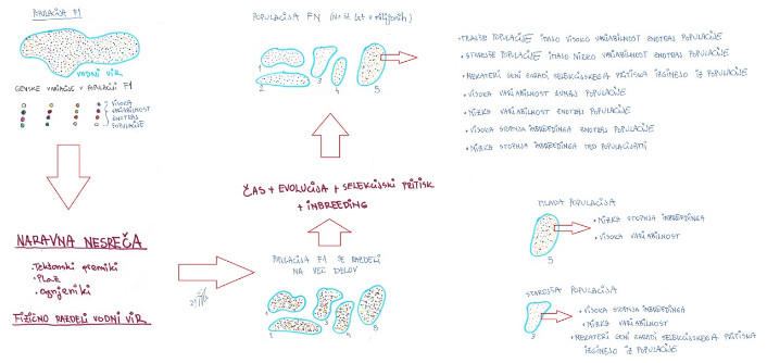 Shematski prikaz, kako s pomočjo naravnih nesreč, evolucije, časa in inbreedinga nastanejo populacije znotraj vrste.