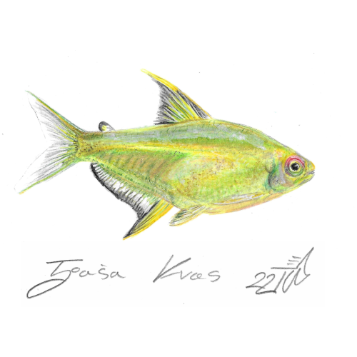 Ilustracije ribe Citronska tetra s tehniko suhe barvice. Možen nakup originalne slike z okvirjem ali brez, velikost slike je cirka 148 x 210 mm.