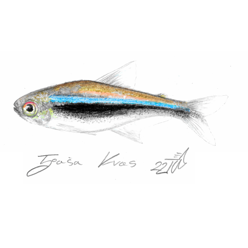 Ilustracije ribe Črna neonka s tehniko suhe barvice. Možen nakup originalne slike z okvirjem ali brez, velikost slike je cirka 148 x 210 mm.