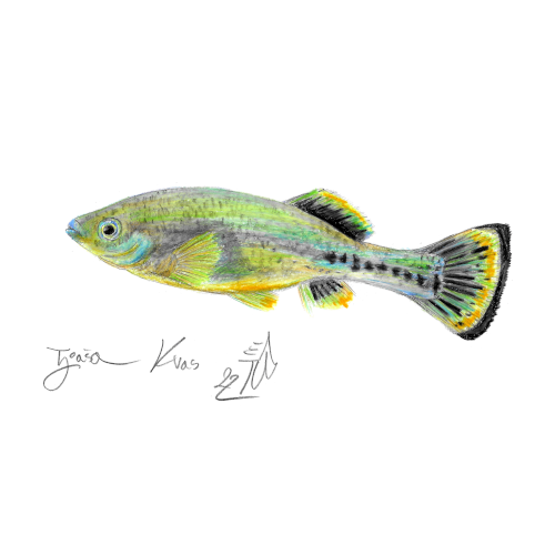 Ilustracije ribe Goodeid s tehniko suhe barvice. Možen nakup originalne slike z okvirjem ali brez, velikost slike je cirka 148 x 210 mm.