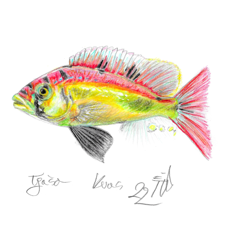 Ilustracije ribe Haplochromis s tehniko suhe barvice. Možen nakup originalne slike z okvirjem ali brez, velikost slike je cirka 148 x 210 mm.