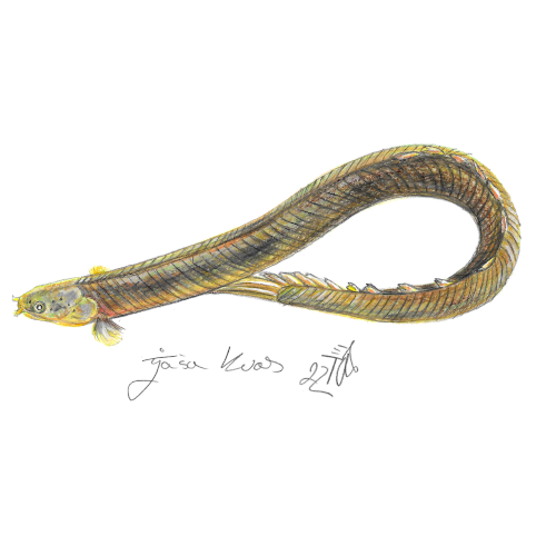 Ilustracije ribe Kačasti mnogoplavutar s tehniko suhe barvice. Možen nakup originalne slike z okvirjem ali brez, velikost slike je cirka 148 x 210 mm.