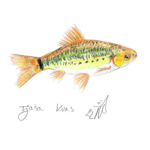 Ilustracije ribe Zlata mrena s tehniko suhe barvice. Možen nakup originalne slike z okvirjem ali brez, velikost slike je cirka 148 x 210 mm.