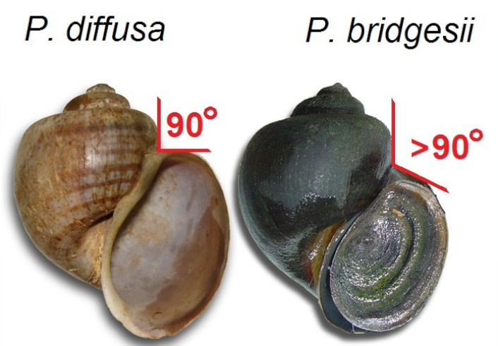 V praksi se zelo dobro obnese tudi klasifikacija glede na obliko hišice oziroma določitev kota med dvema zavojema, ki je za vsako vrsto specifična. Določanje vrst po barvi hišice in noge pa je nemogoče, saj variirajo vse od rumene do skoraj črne. Med akvaristi so najpogostejši rumeni polži z belo nogo, Pomacea difusa, najbolj iskani pa so tisti z belo hišico in modro nogo. Ti najbrž spadajo v vrsto Pomacea bridgesi. Obe vrsti sta znani po številnih barvnih variacijah hišic in noge, možna pa je tudi hibridizacija, ki da plodne potomce, kar klasifikacijo in določanje vrst le še bolj oteži.