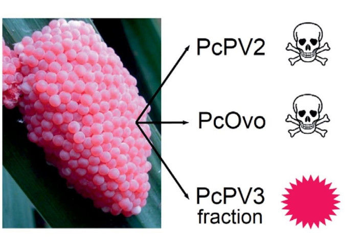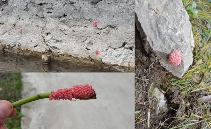 Pomacea (pomacea) canaliculata (Lamarck, 1819) leže jajca, ki so rahlo oranžne barve.