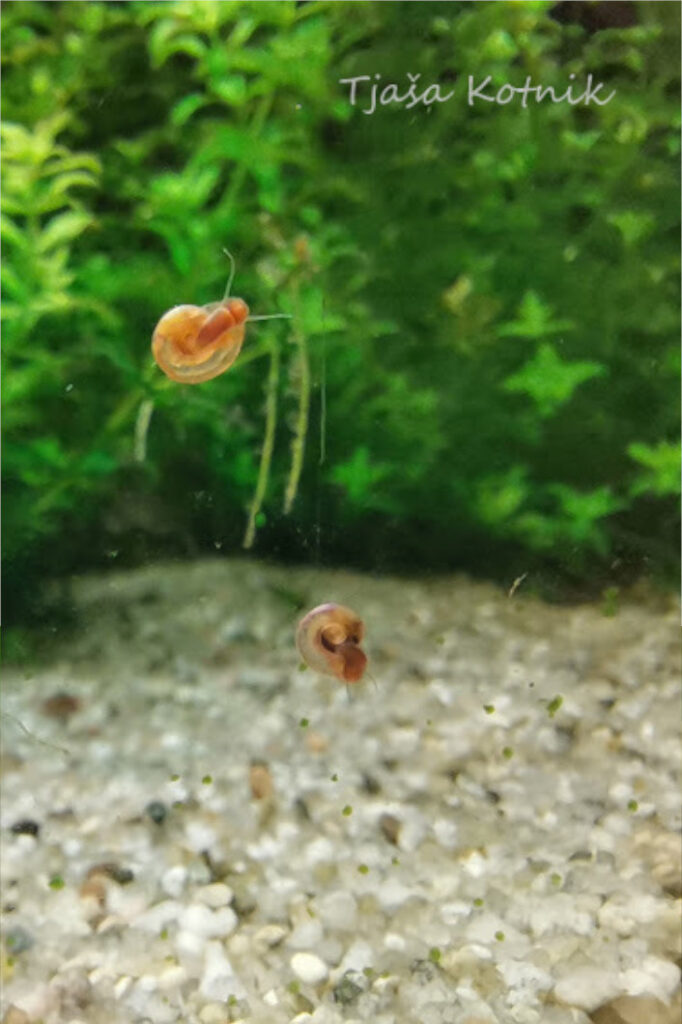 Zaradi majhnosti ga opazimo šele takrat, ko se že razmnoži, načeloma je zelo koristen polž, ki pridno in vztrajno čisti alge ter bakterijski prerast iz različnih površin, pri tem pa ne poškoduje rastlin. Kljub temu ga običajno smatramo kot nezaželenega, saj zaradi izredno majhne velikosti pogosto zaide v rotorje filtrov, kjer povzroča težave. Koristen je lahko v akvarijih, kjer vodo filtriramo z bolj preprostimi metodami filtracije, saj je načeloma zelo koristen polž. Namerno ga naselimo v drstne akvarije, saj bo z veseljem požrl plesnive ikre, zdrave pa bo pustil pri miru.