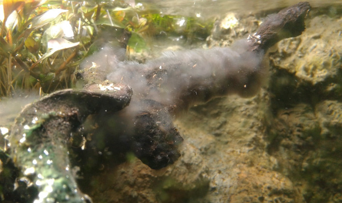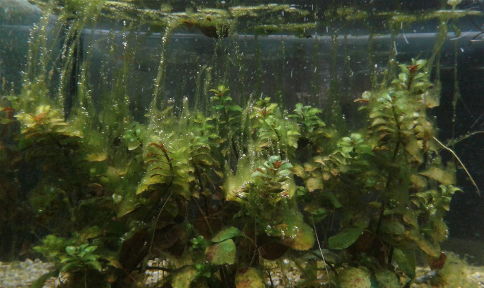Če je hrana, ki jo uporabljamo vsebuje preveč beljakovin, potem lahko pride do navidezne utečenosti, kot se je to zgodilo v akvariju iz prakse na tej povezavi.