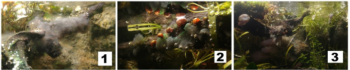 Dan 3 do 14: Pojav sluzi na koreninah, pesku, dekoraciji in ribji hrani. Predvsem je pomembno, da delovanje bakterij opazimo na hrani, če hrana že 7 dni ostaja nespremenjena, potem je to znak, da bakterije še niso začele delovati. V tem primeru preverimo sestavine in deklaracijo hrane. Včasih se zgodi, da je razmerje med ogljikovimi hidrati in beljakovinami neugodno, kar povzroči, da ogljikove bakterije enostavno ne morejo razbiti molekule beljakovin, saj jim zmanjkuje energije. Dušikove bakterije pa ne pridejo do dušika, ki je vezan v beljakovinah, saj za razbijanje molekul potrebujejo pomoč ogljikovih bakterij. To je resna težava, saj se zaradi tega fenomena ogljikov in dušikov cikel ne moreta vzpostaviti. Pomagamo lahko tako, da z beljakovinami bogato hrano menjamo s cenejšo, ki vsebuje več ogljikovih hidratov, ali pa v vodo dodamo čajno žličko sladkorja. SLADKOR DODAMO LE V PRIMERU, ČE SEDMI DAN NA HRANI ŠE NE OPAZIMO BAKTERIJSKE AKTIVNOSTI (ZNAKOV RAZGRADNJE)!