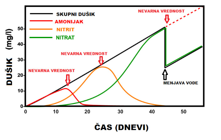Dan 14. Je zelo ključen, saj vam bo večina akvaristov rekla, da je akvarij pripravljen za naselitev rib. To žal v večini primerov ne drži, saj v akvariju še ni vzpostavljen dušikov cikel. Zelo pomembno je, da v tem obdobju začnemo redno spremljati koncentracije amonijaka (NH3/NH4), nitritov (NO2) in nitratov (NO3).