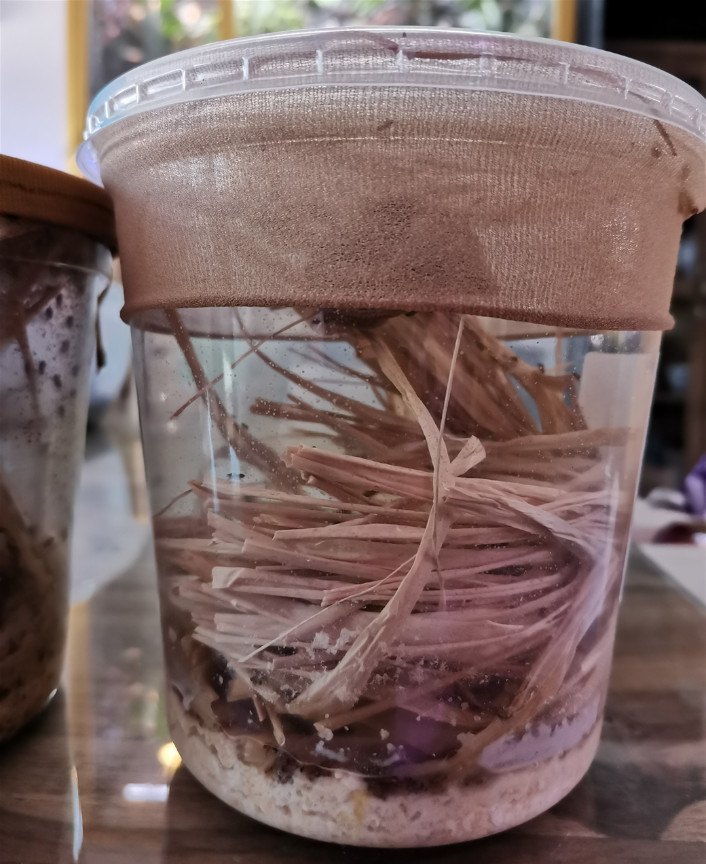Ličinke so bele barve, strokovno jih imenujemo žerke, nahajajo se v substratu. Odrasle živali letajo po posodici in se najraje nahajajo na pokrovu. Bube pa se največkrat nalepijo na stene posode in rafije. Mlade bube so bele barve, s časom pa postanejo rjave ali črne. Zelo pomembno je, da med nego kulture ne uničimo preveč bub in ličink, saj si s tem slabimo pridelek, zato zamenjamo le toliko rafije in substrata, kot je potrebno.