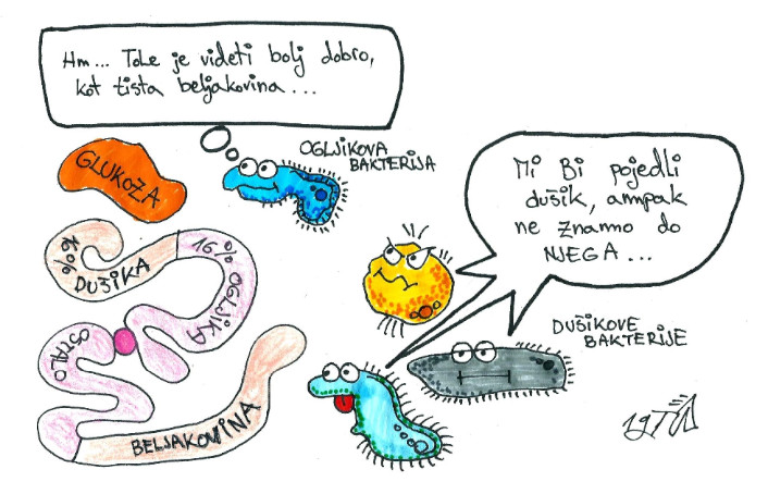 Beljakovine so sestavni del vseh organizmov, sestavljene so iz 16% dušika in 16% ogljika. Najdemo jih v razpadajoči rastlinski masi, poginulih živalih, odmrlih celicah in celo v ribji hrani. Vsa ta materija predstavlja hrano za bakterije, ampak te so zelo izbirčne in bodo jedle le tisto, za kar so specializirane, da prebavijo. Ogljikove bakterije bodo zato jedle samo komponente, ki vsebujejo ogljik, dušikove pa bodo iskale le vire dušika. Poznamo tudi žveplove, fosforjeve, železove in celo uranove bakterije. A v konkretnem primeru nas zanimajo le dušikove ter ogljikove.