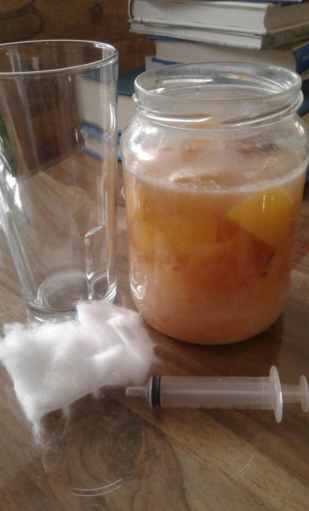 Oprema, ki je potrebna za pobiranje mikročrvov: Kozarec z vodo, vata, brizgalka in kultura mikročrvov.