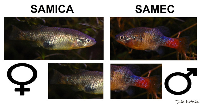 Beseda »xenotoca« je grškega izvora in pomeni »čudni zarod« oziroma »čudni mladiči«. Ime se nanaša na mladice, ki se skotijo s posebnim organom, ki ga imenujemo trophtaenia in v dobesednem prevodu pomeni "Materina vez". Organ je videti kot skupina zajedavcev, ki lezejo mladici iz anusa in je s svojim videzom prestrašil številne nepoznavalce. Trophtaenia služi podobnemu namenu, kot popkovina pri mladičih sesalcev, mladice jo odvržejo v nekaj urah ali dneh po rojstvu. Organ je značilen za celotno družino Goodeidae, v primeru, da opazimo mladico z izrastki, se moramo zavedati, da imamo neverjetno srečo.