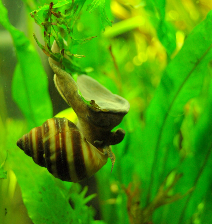 Ustreza mu temperatura vode od 15 do 28°C. Raje ima trdo in alkalno vodo, saj v mehki vodi hišica hitro izgubi trdoto ter barve. Je enospolnik, samica koti žive mladiče, ki so veliki od 2 do 4 mm, običajno jih je okoli 20 na leto. Posebnost pri tej vrsti je, da samica koti mladiče različnih velikosti. Samca z lahkoto spoznamo po penisu na desni strani. Običajno so v prodaji črtasti osebki, v naravi pa najdemo tudi črne ter rjave živali. Zaradi posebne oblike ter mirne narave je ta polž primeren za večino skupinskih akvarijev.
