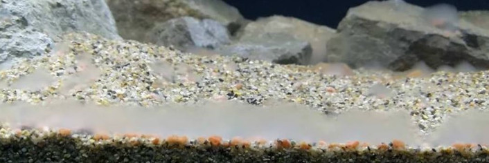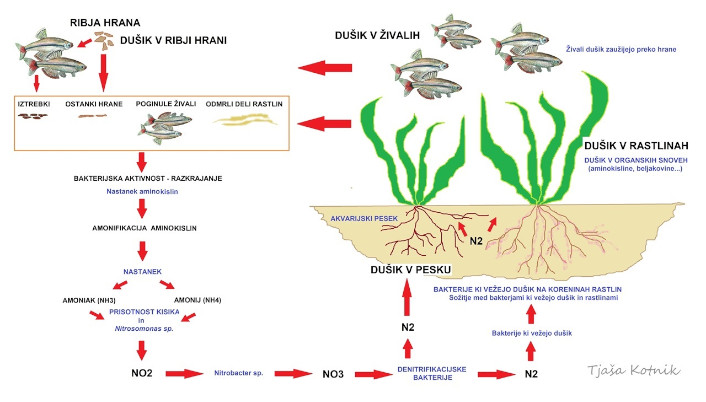 Debela plast sluzi, ki je sestavljena iz heterotrofnih bakterij prekriva plasti hrane ter ostankov sladkorja. Postopek imenujemo gnitje oziroma amonifikacija. Ta od heterotrofnih organizmov zahteva veliko energije, zato poteka zelo počasi. Heterotrofne bakterije cepijo kemijske vezi med aminokislinami, da pridejo do atomov ogljika, za njimi ostanejo aminokisline, ki se skozi postopek amonifikacije spremenijo v amonijak. Ta predstavlja glavni vir hrane za bakterije iz rodu Nitrosomonas sp. Te ga predelajo v nitrite (NO2), ki predstavljajo hrano za Nitrobacter sp. Ta skupina dušikovih bakterij NO2 predela v nitrate (NO3). Avtor fotografije: Igor Cerar
