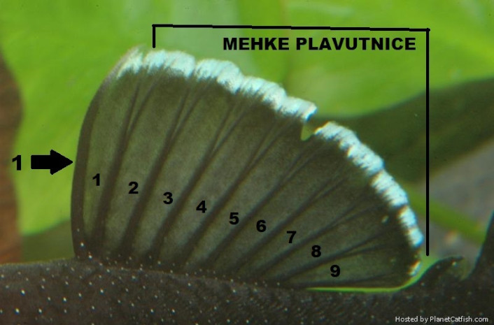 Hrbtna plavut modrega rogatca (Ancistrus dolichopterus), kjer se lepo vidi ena trda in devet mehkih plavutnic.