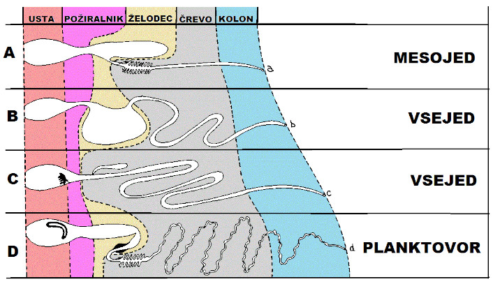 Slika prikazuje shemo prebavil štirih različnih vrst, ki so po načinu prehranjevanja med sabo različne. Anatomske značilnosti prebavil nam veliko povedo o prehrani živali. Mesojede vrste imajo velike z mišicami obdane želodce in kratko črevo. Velik želodec služi kot skladišče, saj ribe pogoltnejo celi plen, običajno je ta veliko večji od ribe, zato je velik in raztegljiv želodec še kako dobrodošel. Prebava mesa in maščob poteka preko encimov, ki jih izločajo žleze v želodcu in črevesju. Večina prebave se zgodi v zgornjem delu prebavnih poti. Meso sestavljajo pretežno beljakovine in maščobe, težje prebavljivih snovi, kot so surove vlaknine je zelo malo. Običajno surovo vlaknino predstavljajo kosti in oklepi nevretenčarjev. Bakterijska razgradnja snovi poteka v kolonu, ampak je zanemarljiva. Organizem mesojeda je narejen tako, da hrana čimprej zapusti telo, saj gnitje mesa v organizem sprošča številne strupene snovi. Pri rastlinojedih vrstah so želodci manjši, črevo pa je daljše, razlog za to je vsebnost celuloze v celičnih stenah rastlin. Večina prebave poteka v črevesu ter kolonu s pomočjo črevesnih bakterij, ki so naseljene v črevesu živali. Te potrebujejo veliko površino, zato so prebavila rastlinojedov daljša. Hrana rastlinskega izvora se v organizmu zadržuje daljši čas kot hrana živalskega izvora, saj za prebavo potrebuje več časa in energije, predvsem pa pomoč koristnih bakterij. Zelo posebna oblika prebavil pa se pojavlja pri živalih, ki se hranijo s planktonom. Iz biološke perspektive je plankton mešanica različnih vrst alg, mikroorganizmov ter ličink nevretenčarjev. Takšna hrana je na kemijski ravni sestavljena iz različnih hranilnih snovi, vsebuje tako beljakovine in maščobe, kot tudi hitin in celulozo. Takšna hrana zahteva posebno prilagoditev, zato pri teh živalih opazimo anatomske značilnosti rastlinojedov ter mesojedcev. Planktovori imajo dokaj velike želodce ki služijo kot skladišče, črevo pa je tanko, nagubano in dolgo. Takšna prebavila služijo prebavi hitina, ki je glavni gradnik oklepov pri nevretenčarjih. Pri planktovorih se hitin prebavlja kot celuloza saj predstavlja glavni vir sladkorja, kar pomeni, da prebava poteka v črevesu s pomočjo bakterij.