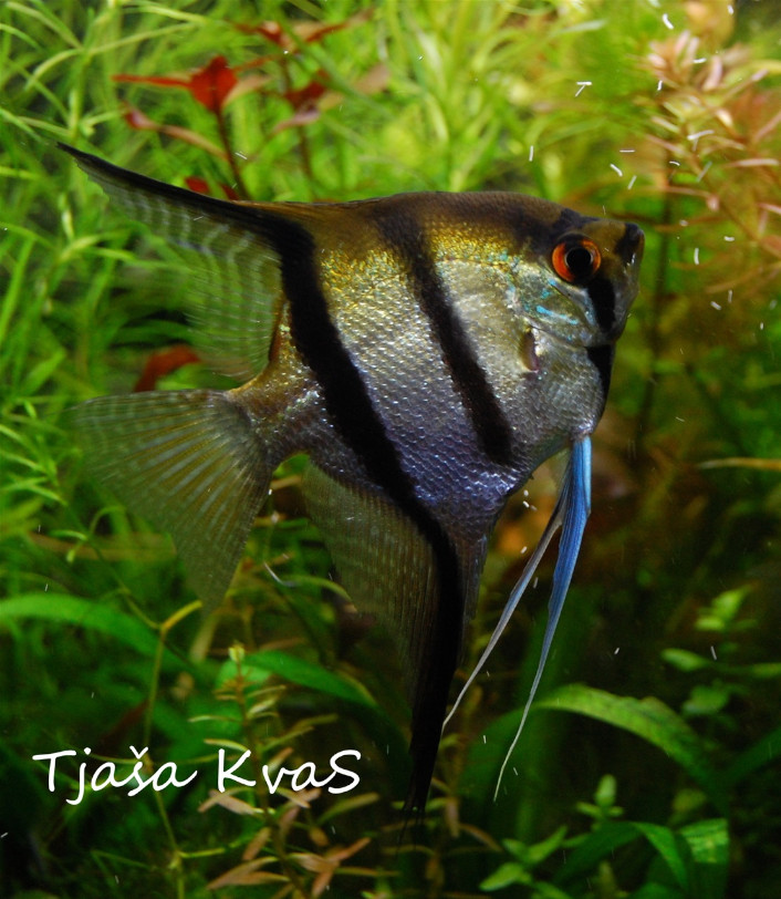 Vrsta Pterophyllum scalare ima okoli 15 podvrst, ki živijo v naravi ter čez 150 barvnih variacij, ki jih poznamo v ujetništvu. Je dokaj miroljubna riba, ki je primerna za skupinske akvarije. Dobro se ujame z oklepnimi somiči iz roda Corydoras, rogatci in večjimi karacinidi ter tetrami. Manjše prebivalce, kot so neonke, kresničke in podobne drobne ribe lahko zamenja za hrano. Idealna družba za njo so žalovalke (Gymnocorymbus ternetzi), golšarice (Carnegiella sp.), Tetre iz roda Hemigrammus in diamantna tetra (Moenkhausia pittieri).