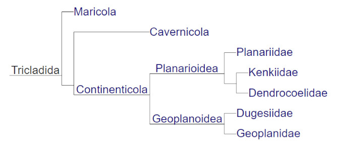 Sistematika planarij je zelo kompleksna, red Tricladida se razdeli na tri podrede Maricola, Cavernicola in Continenticola, ta je za akvariste zanimiv zato, ker vanj uvrščamo vse sladkovodne planarije, ki jih najdemo v ribnikih ter akvarijih. Razdeli se na super družino Planarioidea in Geoplanoidea. Ta pa se razdeli na družini Dugesiidae in Geoplanidae. Planarioidea je razdeljena na tri družine Planariidae, Kenkiidae in Dendrocoelidae. Vsaka pa je sestavljena iz več rodov in vrst.