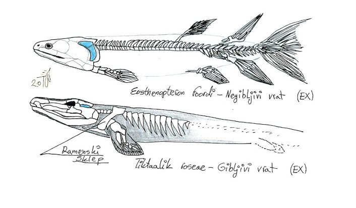 Ribe spadajo med najstarejše vretenčarje in na neki stopnji evolucije, so se nekatere odločile, da bodo zavladale kopnemu. Ena iz med takih je bil Tiktaalik, za katerega predvidevajo, da se je obnašal podobno kot danes živeča sprehajalka (Periophthalmodon septemradiatus). Toda poleg obnašanja naj bi Tiktaalik in sprehajalka imela še nekaj skupnega. Oba imata uho, ki je prilagojeno, da sprejema zvočne vibracije, ki potujejo po zraku. Da sprehajalke na kopnem glasno komunicirajo med sabo, je dokaj novo odkritje in nam postavlja številna vprašanja o evoluciji ušesa ter o razvoju komunikacije. Predvidevamo, da so podoben način komunicirale tudi prve »kopenske« ribe, kot so Tiktaalik in Acanthostega. Pri preučevanju fosilov so odkrili ušesu podoben organ, ti vretenčarji so bili prvi, ki so razvili uho za zaznavanje zvočnih vibracij na kopnem. Predvideva se, da je evolucija takšnega ušesa povezana s pojavom ramenskega sklepa ter odsotnostjo ribjega mehurja, kar opazimo tudi pri sprehajalki. Ramenski sklep omogoča, da se vratna vretenca lahko osvobodijo, kar omogoča premikanje glave. To je sposobnost, ki jo večina rib nima, saj je glava fiksno pritrjena na hrbtenico s številnimi kostmi. Med njimi so tudi kosti, ki so povezane z notranjim ušesom. S pojavom ramenskega sklepa, so se slušne kosti morale preoblikovati v samostojen organ iz katerega se je kasneje razvilo uho, kot ga poznamo pri plazilcih, ptičih in sesalcih.