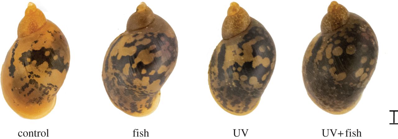 Tretja skupina polžev je bila izpostavljena UV svetlobi, da so se zaščitili pred škodljivimi vplivi UV žarčenja, so polži razvili hišice z več lisami.